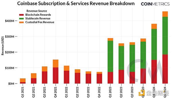 Coinbase的2024年第二季度收益顯示收入來源發(fā)生了變化,交易收入環(huán)比下降27%,但訂閱和服務(wù)收入環(huán)比增長17%,其中穩(wěn)定幣收入是最大的來源。