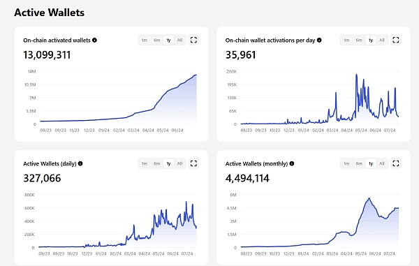據(jù)TonStat統(tǒng)計(jì),TON鏈上的活躍錢(qián)包數(shù)量從年初的108萬(wàn)增長(zhǎng)到現(xiàn)在的1310萬(wàn)。