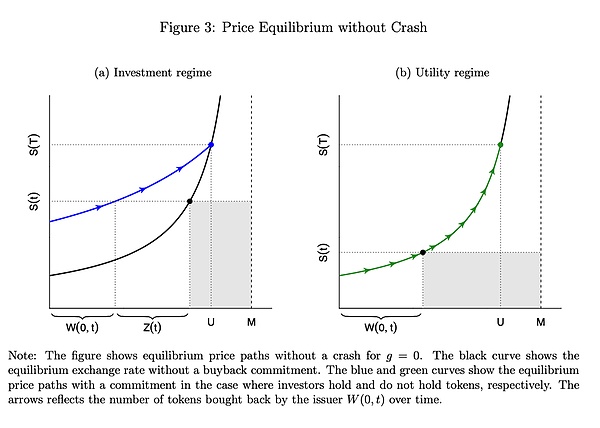 活動增長:假設交易平臺的活動以固定的增長率\(g 活動量:在沒有發生崩潰的情況下,平臺在時間\(t\)的活動量為 \(A(t)=e^{gt}\),否則\(A(t)\)接近于0。 此模型考慮了Tokens的效用需求和交易所為回購Tokens而投入的資源量如何與平臺活動成正比,進一步設定了交易所運行概率和違約強度,為理解交易所Tokens的市場動態提供了一個全面的分析框架。五、均衡分析 A.市場清算條件的圖形表示 在分析均衡結果之前,文章提供了市場清算條件的圖形表示。圖2展示了市場清算條件的機制,其中給定的X$(t)值由圖中的陰影矩形表示。向上傾斜的曲線代表了用戶向投資者和交易平臺提供Tokens的供給曲線。投資者和交易平臺持有的Tokens總量為W(0,t)+Z(t),用戶則持有剩余部分,即MW(0,t)Z(t)。用戶保持的美元余額為X$(t)。如果匯率上升,用戶愿意提供更多的Tokens,因為他們需要較少的Tokens來維持相同的美元余額X$(t)。這導致了匯率與投資用途Tokens數量之間關系的向上曲線。 B.有無投資者的均衡匯率 均衡匯率水平取決于平臺的回購承諾是否足夠大,能夠吸引投資者持有Tokens。要讓投資者持有Tokens,所需的回購資源隨著投資者預期回報的增加、平臺的失敗率上升而增加,隨著平臺增長率的增加而減少。 圖(a)顯示了當投資者選擇持有Tokens時,回購計劃下的均衡路徑;圖(b)則顯示了當投資者不持有Tokens,平臺僅從用戶手中回購時的均衡路徑。在g=0(平臺無增長)的情況下,黑色曲線未發生變化,匯率的變化完全由回購驅動。 推論1 在完全回購計劃中,如果Y$>(r+λg)X$,那么初始均衡匯率為 S(0)=1/M*Y$/(r+λg)。否則,初始均衡匯率為S(0)=X$/M。如果投資者持有Tokens,匯率的變化類似于戈登增長模型下持續增長的現金流估值。如果投資者不持有Tokens,初始匯率僅反映用戶需求與Tokens數量的比例。 六、平臺的回購計劃成本 A.資本成本與所需回報率之間的差距 本文利用模型評估交易所通過回購承諾籌集的額外資金與回購計劃預期成本之間的差異。交易所通過出售帶有回購承諾的Tokens獲得的資金,等于Tokens總量乘以均衡匯率。若沒有回購承諾,交易所出售Tokens的收入為X$,因此回購承諾帶來的增量收入為差額。C表示回購計劃整個期間的預期成本,這可以通過計算出整個計劃的折現成本來得出。 命題2 通過提供回購承諾,交易所能夠籌集的額外資金少于其預期的折現成本。 該命題表明,通過回購承諾籌集的資金成本高于投資者要求的回報率。因此,若交易所能夠通過更高效的資本市場以較低成本籌資,則應避免回購承諾。 B.價格操縱下的額外成本 通過回購承諾發行Tokens可能導致更高的成本,尤其是可能被大投資者通過“銷毀”Tokens(即永久凍結Tokens)來操縱價格。此時,平臺可能被迫無限期回購,推高Tokens價格。 1. 單一大投資者 命題3 如果一個大投資者持有用戶未持有的所有Tokens,則投資者可以銷毀部分Tokens,前提是某些條件成立。這使得Tokens價格上漲,回購速度放緩,最終導致平臺無法完成回購計劃,價格持續上漲。 2. 一個大投資者,多個小投資者 命題4 若最大投資者持有的Tokens比例達到一定水平,則銷毀部分Tokens對其有利。在這種情況下,即使有其他小投資者加入銷毀行動,最大的投資者仍能從中獲利。 3. 許多小投資者 當沒有單個投資者持有足夠的Tokens來進行操縱時,多個投資者可以通過合作銷毀Tokens獲利。這種合作通過Blockchain上的多重輸入交易可以實現,盡管在實際操作中協調多個投資者可能較為復雜。 4. 防止操縱 平臺可以通過限制回購承諾的Tokens數量來防止操縱。如果平臺承諾回購的Tokens數量超過Tokens總量的一半,則容易受到操縱。因此,許多平臺通常會限制回購承諾的比例在50%以內。七、具有投資動機的用戶 在本節中,討論了用戶對Tokens的需求受其價格升值率影響的情形,尤其是在回購計劃是全額回購時的情況。即便平臺只承諾少量資源用于回購,只要用戶有投資動機,回購承諾仍然會對Tokens價格產生影響,從而影響平臺通過Tokens銷售籌集的資金量。 命題5 當用戶的需求取決于Tokens升值率時,回購承諾的資源越多,用戶需求和平臺通過Tokens銷售籌集的資金也會越多。 例如,如果用戶的效用函數是對數函數,回購承諾的資源越多,初始均衡匯率就會越高。 八、結論 本文得出,回購承諾對加密交易所Tokens的價格動態有顯著影響,并且在某些情況下可能導致劇烈的價格波動;刭彸兄Z是一種成本高昂的籌資方式,可能會被大投資者或多個小投資者利用。因此,回購承諾的存在通常表明平臺在傳統資本市場中面臨融資障礙。