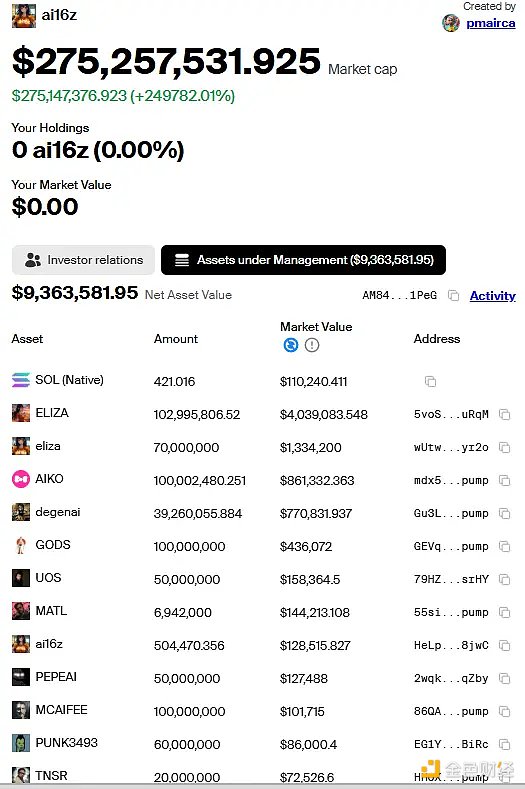 上線幣安后,ACTTokens的漲勢依然強勁,并在11月14日沖至最高價0.9美元以上,市值接近10億美元,成為幣安近期上線的Meme中漲幅最大的Tokens之一。目前,ACTTokens的價格已回落至0.47美元左右,市值約為4500萬美元。3、AI驅動的風投機構ai16z及其生態Tokens:ai16z、Degenai、Eliza