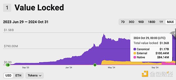 正是在這個背景下,當前L2賽道蓬勃發展。根據L2Beat的數據,市場上已有110條L2或L3擴展解決方案在運行,然而,只有少數L2能獲得主流認可,并產生大量TVL和用戶。截至2024年10月24日,L2擴展解決方案的TVL已經達到了376.2億美元,與一年前相比翻了3倍,顯示出了強勁的發展勢頭和用戶需求。