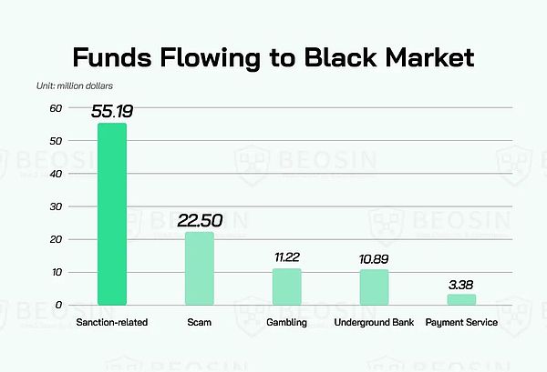 與黑灰產(chǎn)業(yè)直接關(guān)聯(lián)的資金中,約53.49%流向了受制裁平臺(tái),相關(guān)交易次數(shù)甚至是流向地下錢莊的兩倍,總價(jià)值超過(guò)5500萬(wàn)美元,說(shuō)明受制裁平臺(tái)仍然是高風(fēng)險(xiǎn)資金的主要流入地。