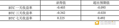 除了美聯(lián)儲每年8次的利率調(diào)整外,美國定期發(fā)布的宏觀數(shù)據(jù)也能反映當(dāng)前貨幣政策下的經(jīng)濟狀況,市場通常根據(jù)這些數(shù)據(jù)預(yù)測貨幣政策改革或經(jīng)濟周期變化,從而影響幣價。重要的宏觀數(shù)據(jù)包括美國季調(diào)后非農(nóng)就業(yè)人口變動、初請失業(yè)金人數(shù)、實際國內(nèi)生產(chǎn)總值(GDP)年化季率以及核心居民消費價格指數(shù)(CPI)月率。下表列出了2024年Bitcoin幣價在這些指標(biāo)發(fā)布當(dāng)天、三天內(nèi)和七天內(nèi)的短期收益率與各宏觀指標(biāo)的錄得值和超出預(yù)期值之間的相關(guān)性。