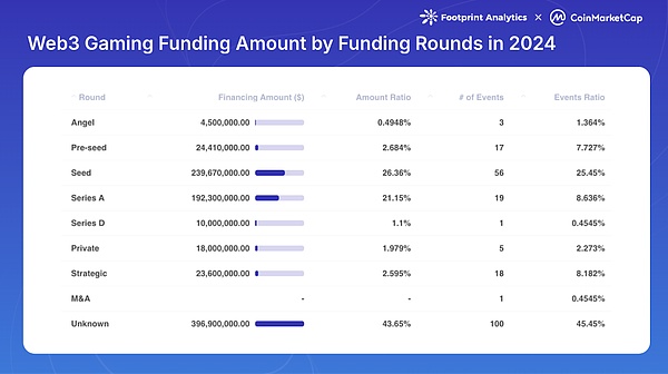 AI還增強了Web3游戲的運營方面。該技術被用于自動化游戲測試流程和監控鏈上交易以防范潛在欺詐或作弊行為,這在具有復雜經濟系統的游戲中尤為重要。此外,AI算法正在幫助優化游戲經濟和Tokens模型,解決Web3游戲設計中的主要挑戰之一。投資格局年度融資事件概覽