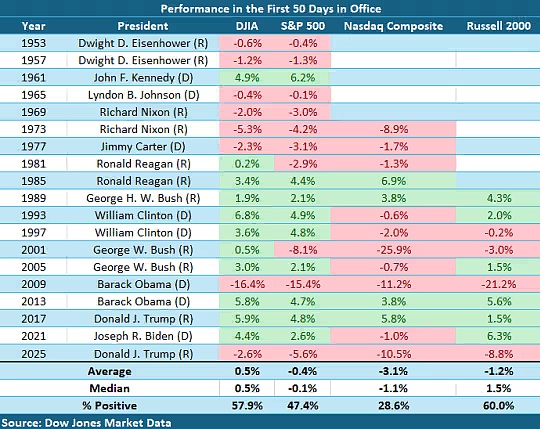 歷史表明,在總統任期的前50天,美股往往會下跌。自1953年以來,標普500指數在此期間的平均回報率為負0.4%,而納斯達克指數在這50天內的平均跌幅為3.1%。