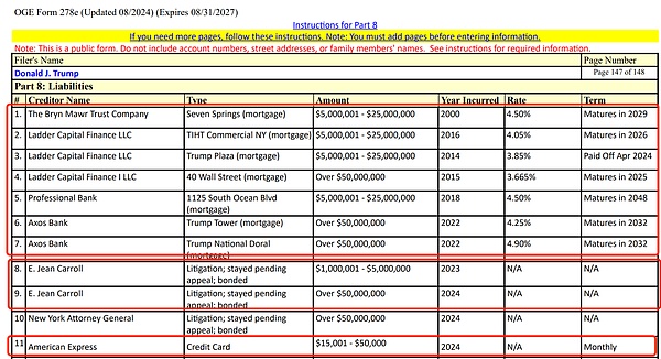 值得注意的是,這份長(zhǎng)達(dá)234頁的財(cái)務(wù)文件中,多達(dá)上百項(xiàng)收入屬于不足201美元以內(nèi)的款項(xiàng),但仍然被詳細(xì)列出。與之相對(duì),美國(guó)前總統(tǒng)拜登在2024年提交的財(cái)務(wù)表格只有11頁,主要收入來源為銀行和退休賬戶等傳統(tǒng)來源,而民主黨總統(tǒng)候選人哈里斯的財(cái)務(wù)表格也只有15頁。