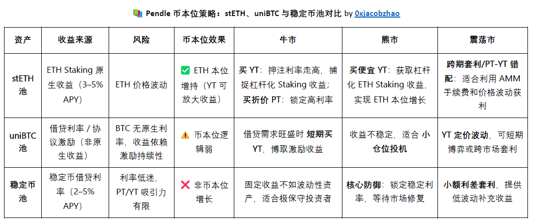 熊市:stETH低價YT提供增持ETH的核心機會;穩定幣池承擔主要防御功能;uniBTC僅適合小規模短期套利。
