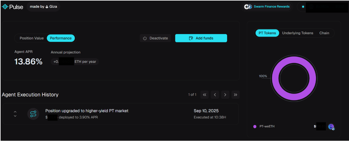 Agent激活與資金管理:用戶可在官方網站(www.usepulse.xyz)一鍵啟動PulseAgent,流程包括連接錢包、網絡認證、白名單驗證,并存入最低0.13ETH(約$500)。完成激活后,資金即自動部署至最優PT市場并進入持續優化循環。用戶可隨時追加資金,系統會自動再平衡與重新分配,后續存入不設最低門檻,大額資金則可提升組合多樣化與優化效果。