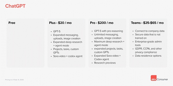 讓我深入分析一下最成功的消費級AI公司是如何構(gòu)建他們的定價策略的。Moore指出,這些公司不再依賴單一的訂閱費用,而是使用包含多個訂閱層級加上基于使用量組件的混合模式。如果用戶耗盡了他們包含的credits(積分),他們可以購買更多或升級到更高的計劃。