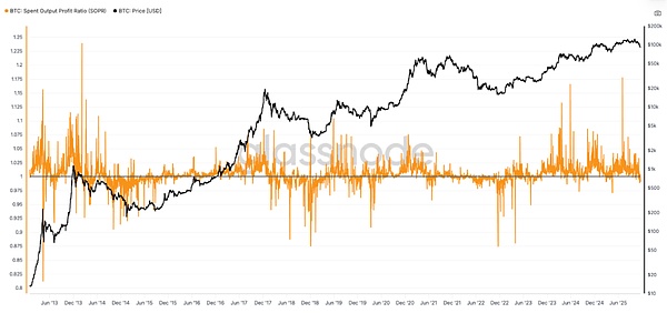 MVRV是市場價(jià)值與實(shí)際價(jià)值之比,當(dāng)MVRV值升高時(shí),意味著Bitcoin處于估值過高狀態(tài)。2023年底MVRV跌至0.8,2024行情好時(shí)曾升至2.8,2025年初回調(diào)中,MVRV回落至2以下,估值沒有高估,也未達(dá)到低估水平,整體周期漲跌節(jié)奏仍在。