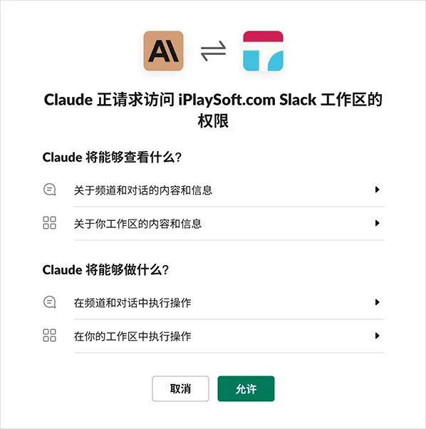 Slack 賬號(hào)和工作區(qū)都準(zhǔn)備好了就可以“一鍵安裝 Claude”了。但現(xiàn)在你需要先準(zhǔn)備一個(gè)美國(guó) IP 的網(wǎng)絡(luò)環(huán)境,然后「點(diǎn)擊 Add to Slack 這個(gè)鏈接」即可在 Slack 里添加 Claude 機(jī)器人應(yīng)用??吹綄?duì)話框,點(diǎn)擊“允許”給予權(quán)限即可,至此我們就已經(jīng)全部搞定了,非常的簡(jiǎn)單!